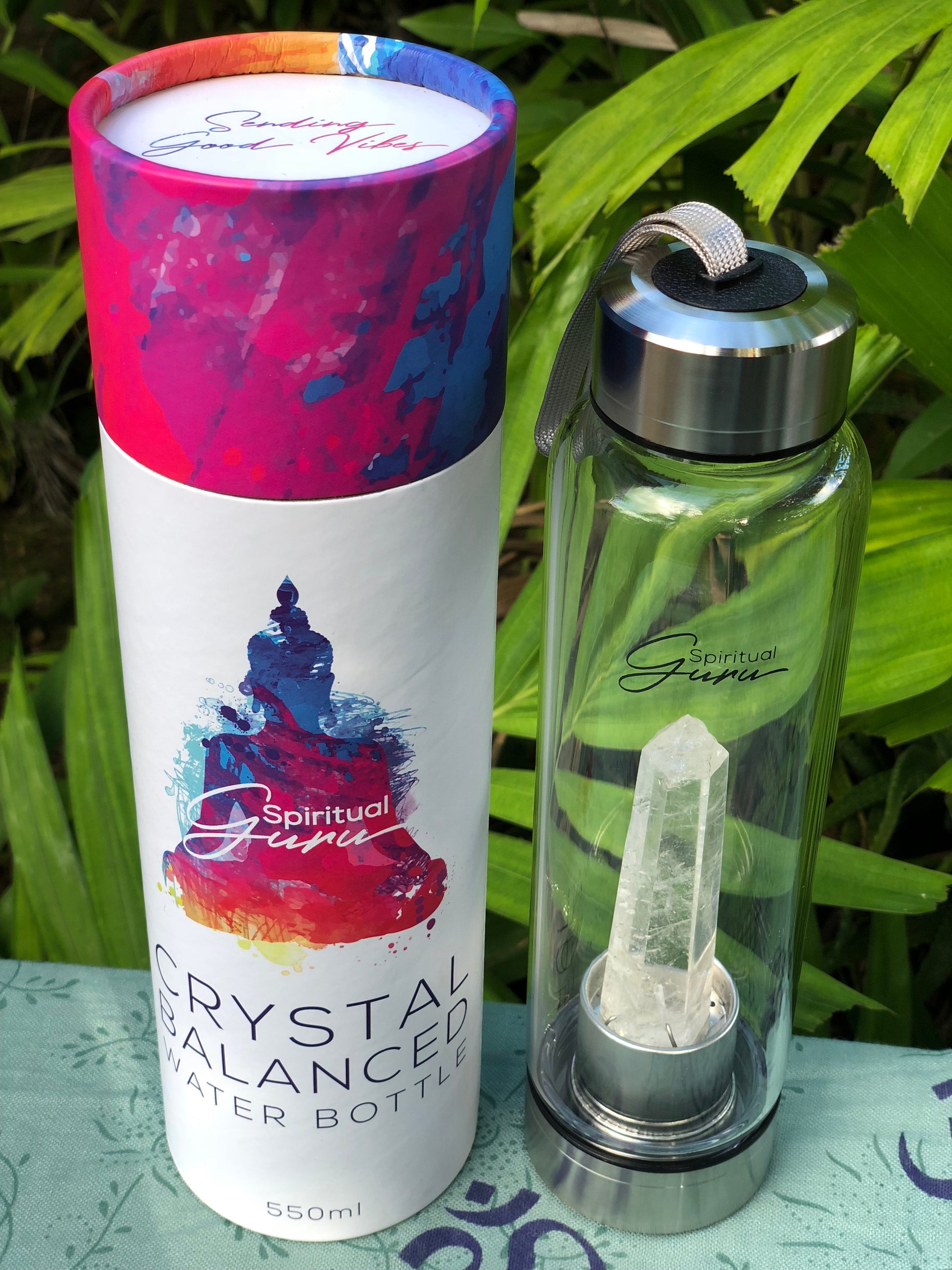 - Our crystal balanced water bottle is made of glass, with a pure natural crystal.
