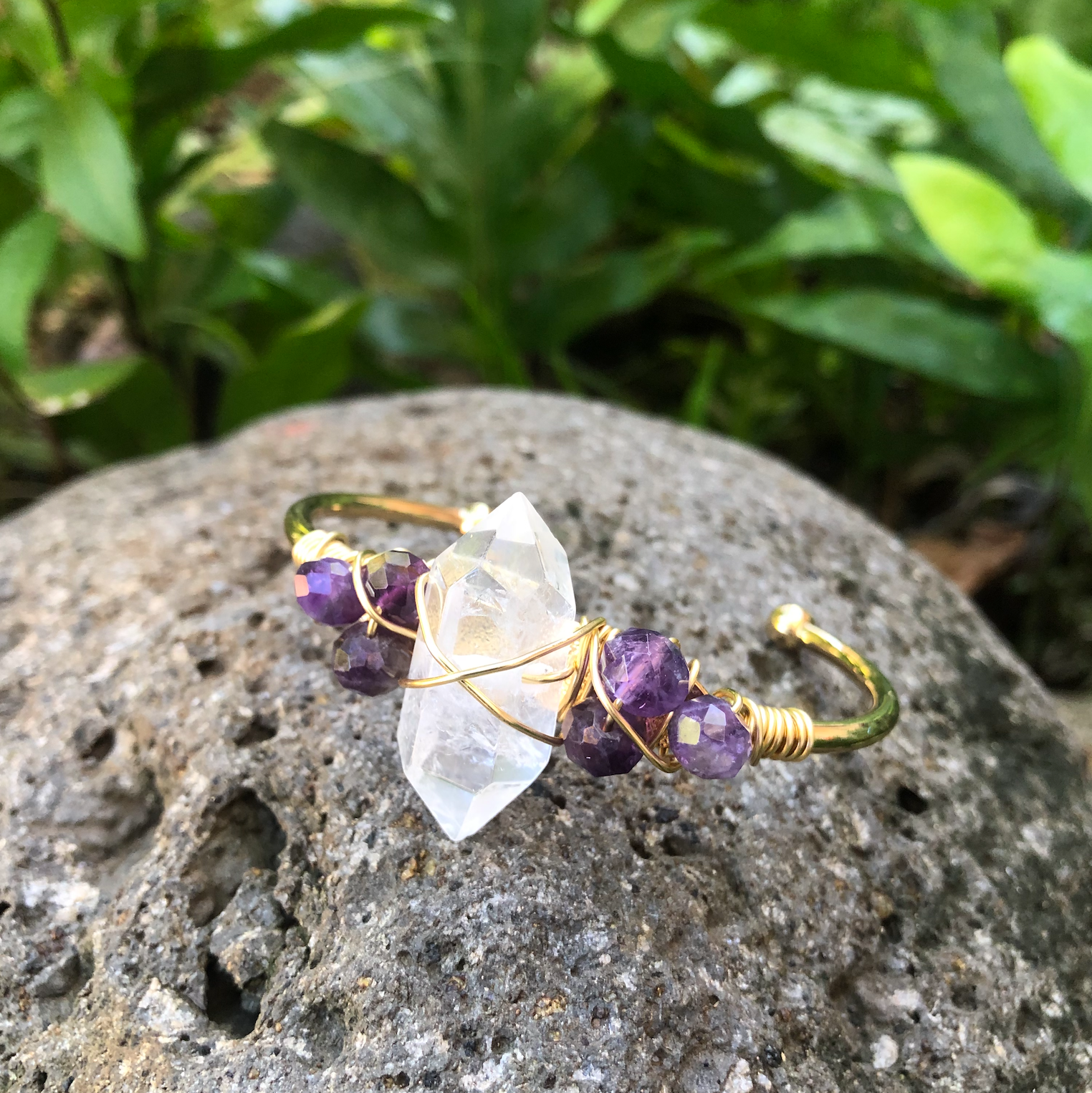 Crystal Quartz & Amethyst Gemstone Gold Bangle Cuff Bracelet ~ "Spiritual Awareness & Protection"